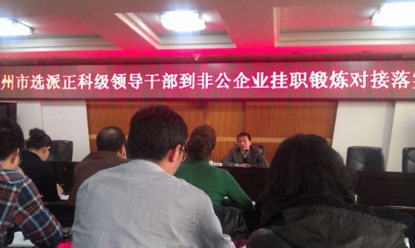 。ňC管中心 鄒秀芳)2013年3月6日下午15時,蘭州市選派正科級領(lǐng)導(dǎo)干部到非公企業(yè)掛職鍛煉對接落實(shí)會議于蘭州市工商局召開。蘭州市工商局黨組成員、紀(jì)檢組長李繼軍主持會議,蘭州市非公辦主任王延紅出席會議。